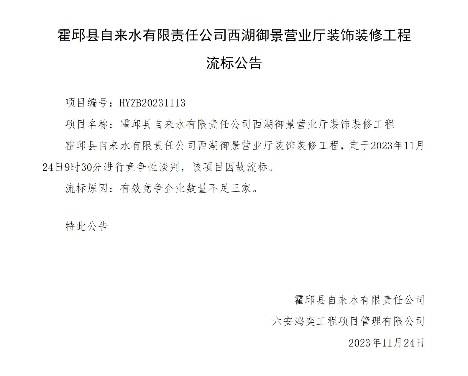 霍邱縣自來水有限責(zé)任公司西湖御景營業(yè)廳裝飾裝修工程流標(biāo)公告