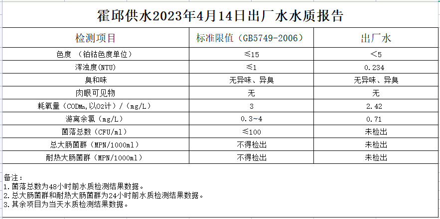 2023年4月14日出廠水水質(zhì)報告
