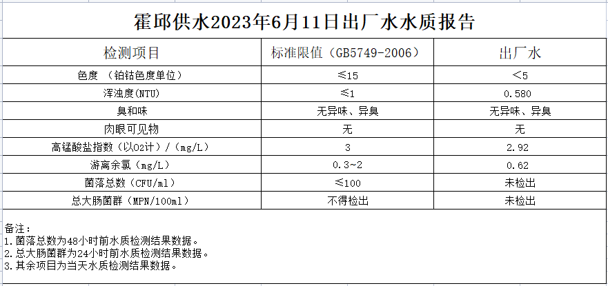 2023年6月11日出廠水水質(zhì)報(bào)告