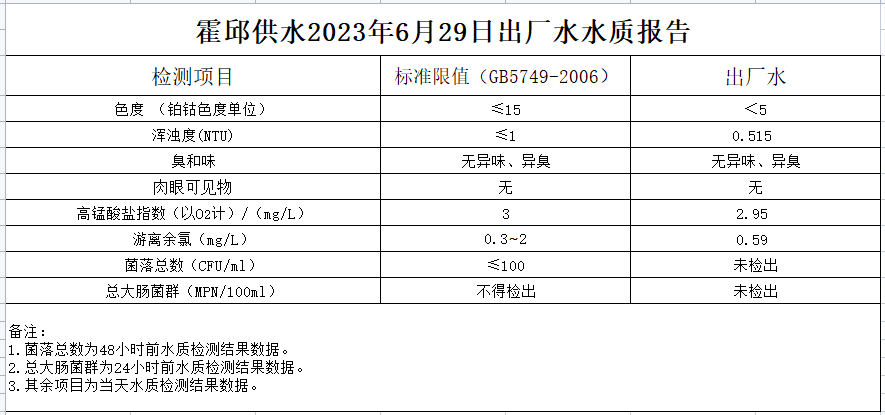 2023年6月29日出廠水水質(zhì)報告
