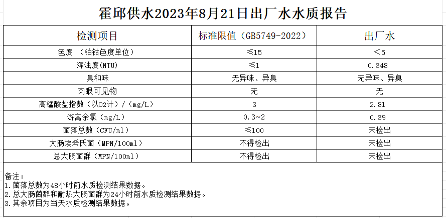 您現(xiàn)在的位置: 首頁 - 通知公告 - 水質(zhì)公告 - 出廠水水質(zhì)(8項) - 2023年8月21日出廠水水...