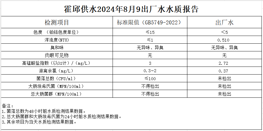 您現(xiàn)在的位置: 首頁 - 通知公告 - 水質(zhì)公告 - 出廠水水質(zhì)(8項) - 2024年8月9日出廠水水...
